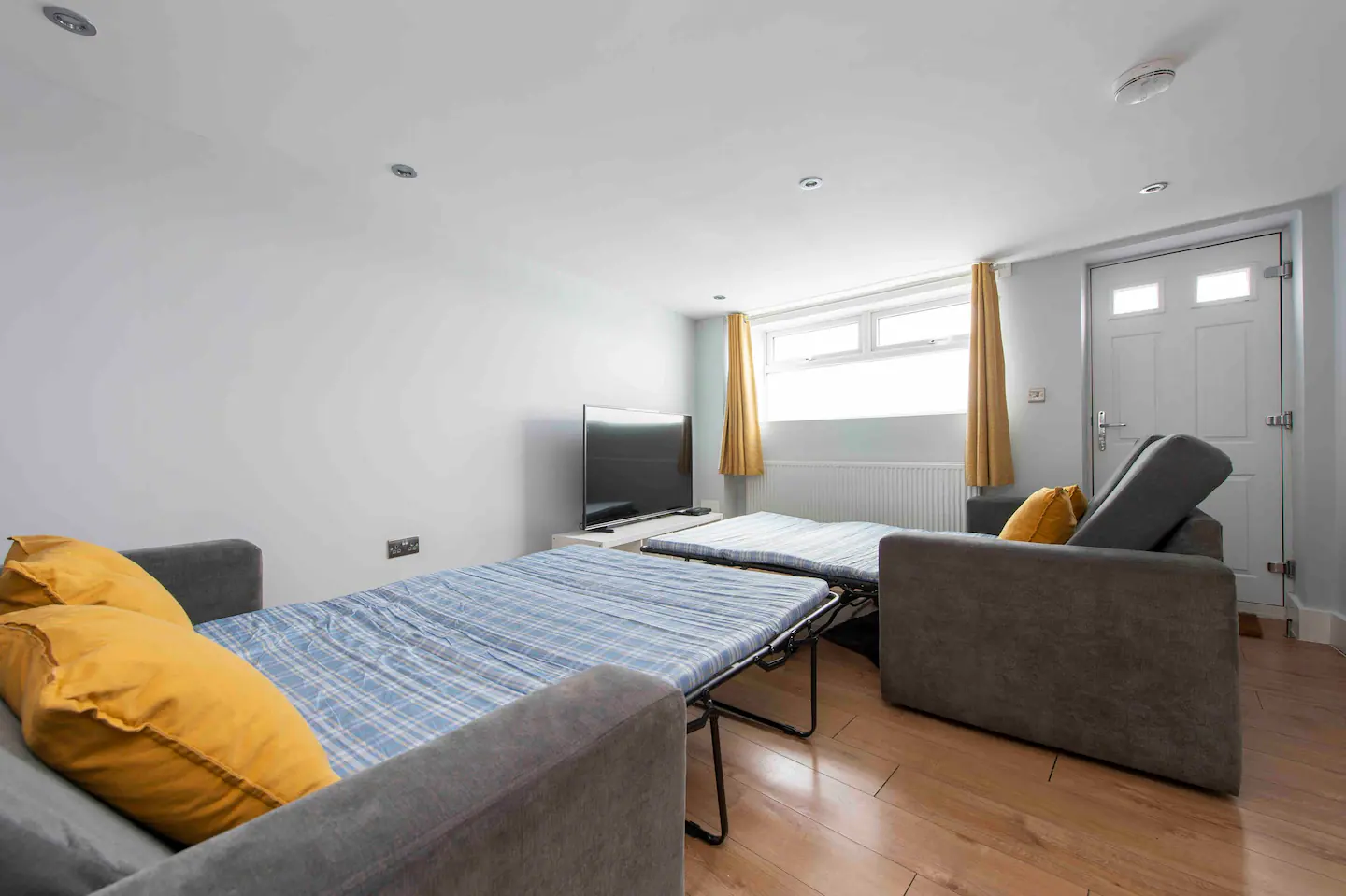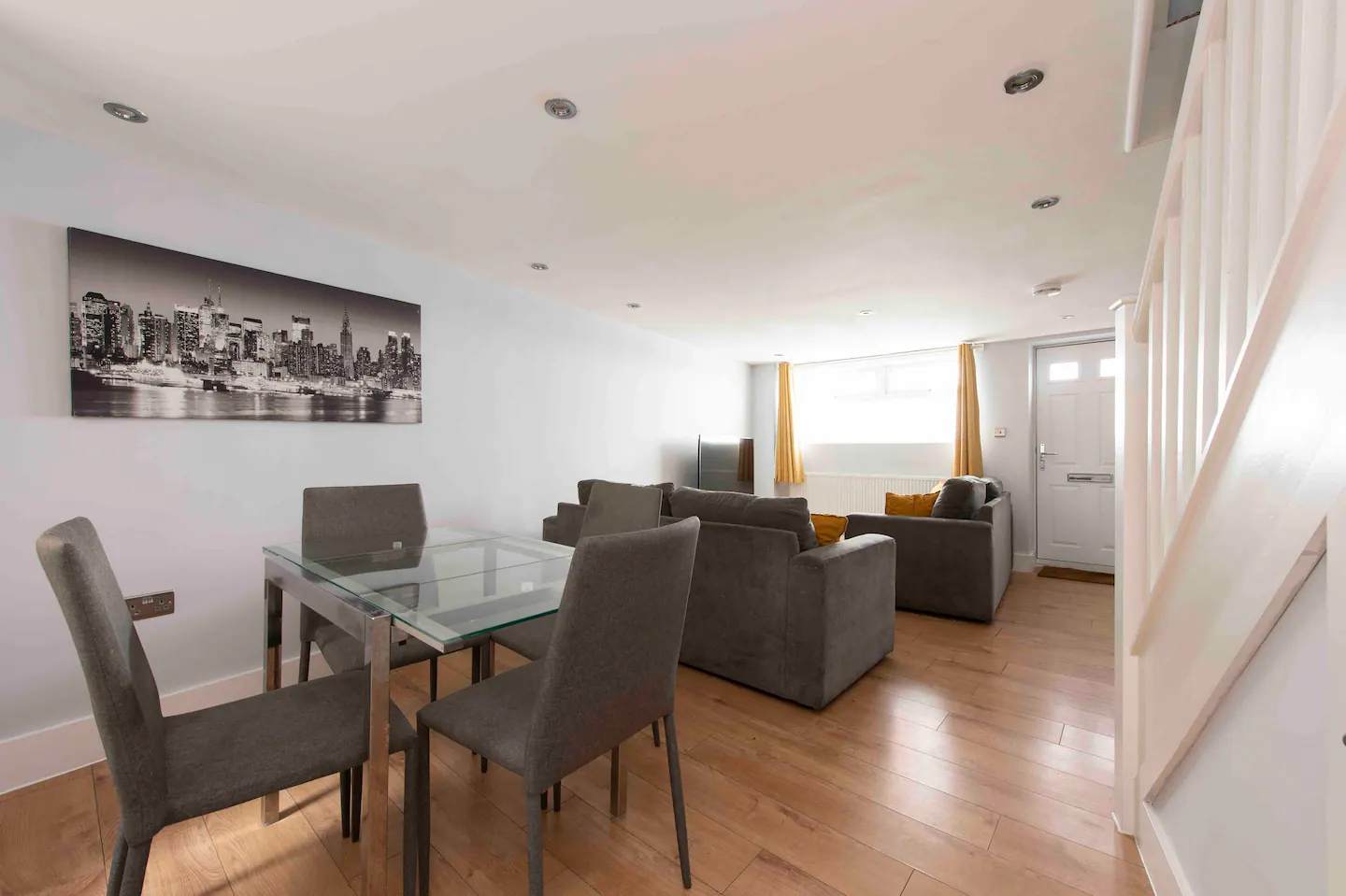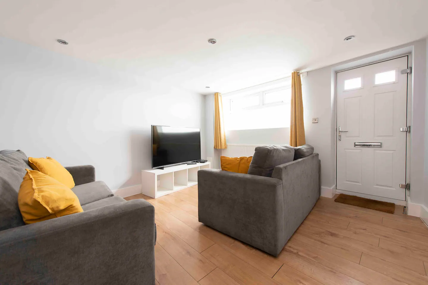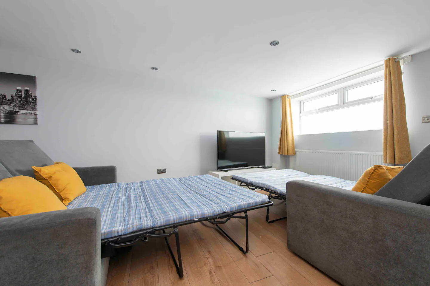Enjoy a stylish experience at this centrally-located 2 Bedroom House with 4 separate beds, 2 sofa beds in the living room, 1 double and a single bed with a 58inch smart Tv with Netflix/YouTube/Amazon Prime.